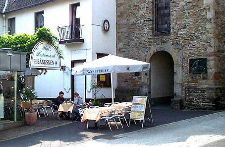![]() Unterhalb des Glockenturmes der ehemaligen Johanniskirche am Durchgang zum Krämersdorf findet sich der Eingang in das Restaurant Bänksken. Die Gasträume erstrecken sich über zwei Etagen eines alten Fachwerkhauses. So sitzt man denn inmitten der frei gelegten Fachwerkbalken, gemütlich aber nicht beengt. Im Sommer stehen einige Tische draußen im Eingangsbereich. |